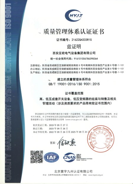 质量管理体系认证证书-西安亚欧电气设备集团有限公司 | 西安高压成套开关柜 | 西安低压成套开关柜 | 西安箱式变电站 | 陕科配件 | 汇创达变频器 | 陕西变频器一体机 | 陕西变频器维修