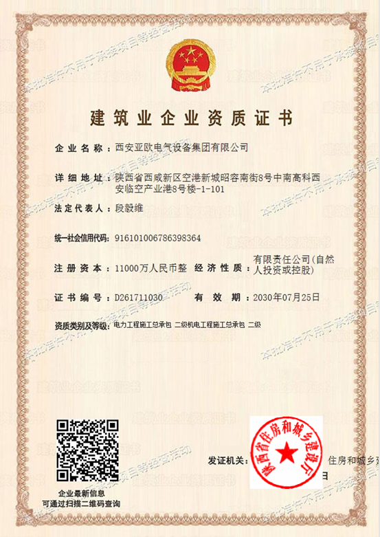 电力、机电承包证书-西安亚欧电气设备集团有限公司 | 西安高压成套开关柜 | 西安低压成套开关柜 | 西安箱式变电站 | 陕科配件 | 汇创达变频器 | 陕西变频器一体机 | 陕西变频器维修