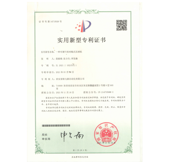 - 关于我们 - 资质荣誉 - 一种可调节的对辊式压球机
