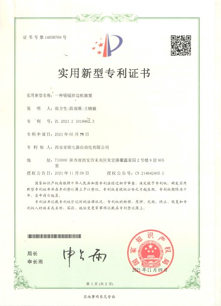 - 关于我们 - 资质荣誉 - 一种镁锭磨边机装置专利