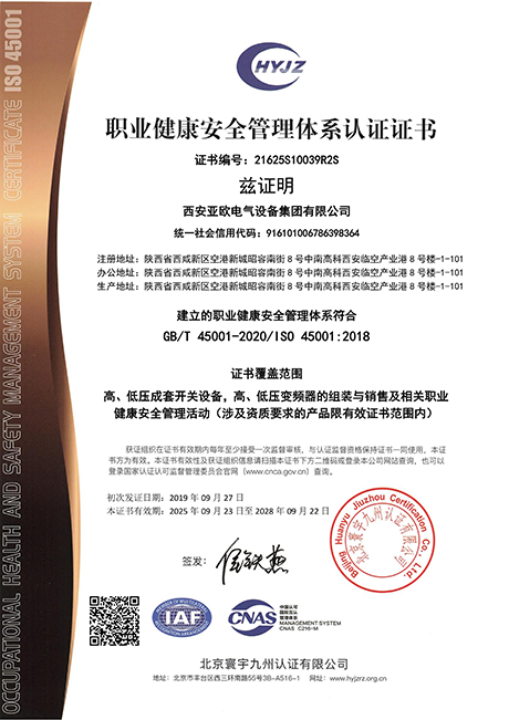 安全体系证书-西安亚欧电气设备集团有限公司 | 西安高压成套开关柜 | 西安低压成套开关柜 | 西安箱式变电站 | 陕科配件 | 汇创达变频器 | 陕西变频器一体机 | 陕西变频器维修