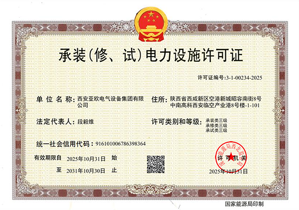亚欧-承装修试 证书-西安亚欧电气设备集团有限公司 | 西安高压成套开关柜 | 西安低压成套开关柜 | 西安箱式变电站 | 陕科配件 | 汇创达变频器 | 陕西变频器一体机 | 陕西变频器维修